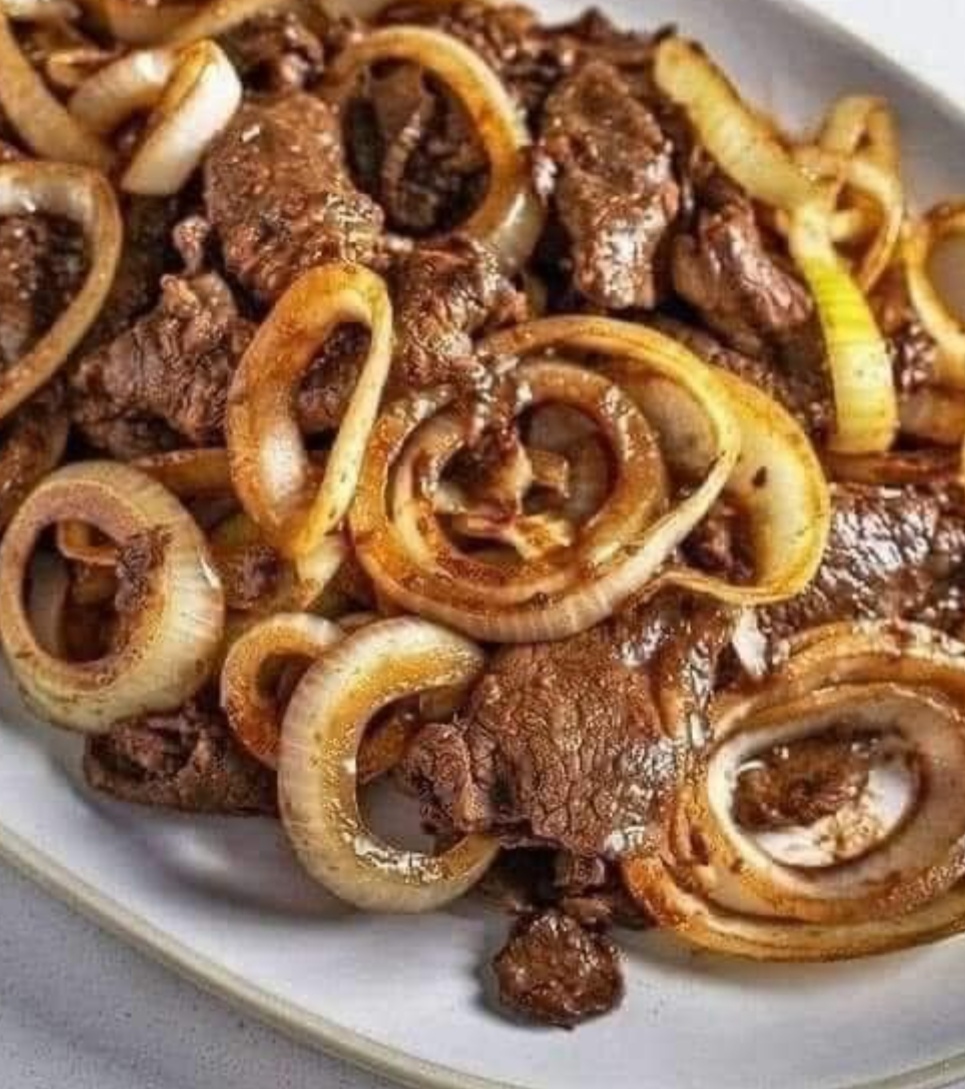 Thin slices of beef liver are cooked in olive oil, then served with caramelized onions. Make sure not to overcook the liver! When cooked to medium rare it’s tender and sweet.