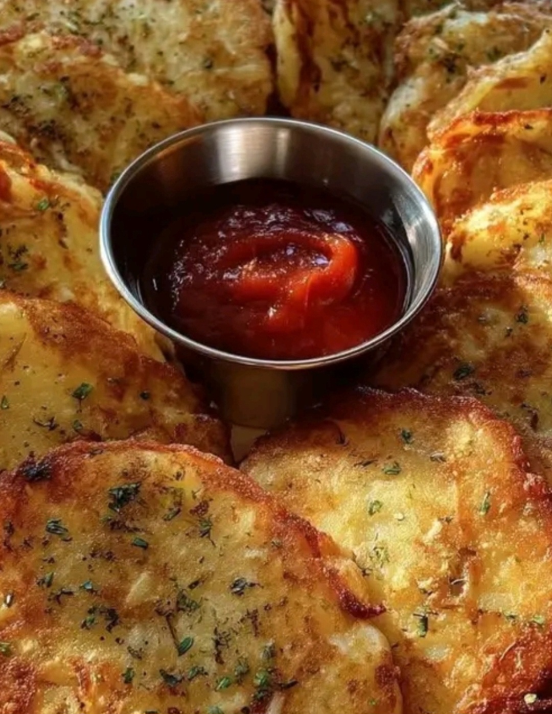 The potato pancakes have a crispy exterior and a tender interior. The recipe uses basic, pantry-staple ingredients. The cooking process is straightforward and results in a versatile side dish or appetizer.