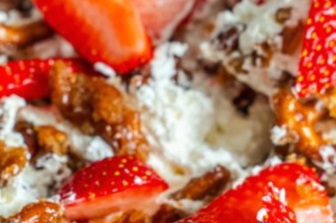 5. For Serving: When ready to serve, gently fold the 4 cups of sliced strawberries and the cooled pretzel crunch into the cream cheese mixture. Mix these in just before serving to maintain the crunchiness of the pretzel layer. If desired, you can reserve some extra pretzel crunch to sprinkle on top of individual servings for added texture and visual appeal.