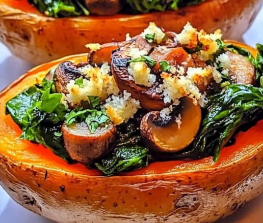 Stuffed sweet potatoes are a versatile, nutritious, and delicious meal that can be enjoyed as a hearty lunch, dinner, or even a side dish. This recipe combines the natural sweetness of roasted sweet potatoes with a savory filling of sautéed spinach, mushrooms, and tangy feta cheese. It’s a perfect balance of flavors and textures, and it’s packed with vitamins, fiber, and protein. Whether you’re looking for a vegetarian meal or simply want to try something new, these stuffed sweet potatoes are sure to impress!Ingredients (Serves 4):4 medium sweet potatoes2 tablespoons olive oil (divided)1 small onion, finely chopped2 cloves garlic, minced8 oz (225g) mushrooms, sliced (cremini or button mushrooms work well)4 cups fresh spinach, roughly chopped1/2 teaspoon smoked paprika (optional, for extra flavor)Salt and pepper, to taste1/2 cup crumbled feta cheese (plus extra for garnish)1/4 cup grated Parmesan cheese (optional)Fresh parsley or cilantro, chopped (for garnish)Instructions:Prepare the Sweet Potatoes:Preheat your oven to 400°F (200°C).Wash and scrub the sweet potatoes thoroughly. Pat them dry and pierce each potato several times with a fork.Rub the sweet potatoes with 1 tablespoon of olive oil and sprinkle lightly with salt.Place them on a baking sheet lined with parchment paper and bake for 45-60 minutes, or until tender and easily pierced with a fork.Prepare the Filling:While the sweet potatoes are baking, heat the remaining 1 tablespoon of olive oil in a large skillet over medium heat.Add the chopped onion and sauté for 2-3 minutes until softened. Add the minced garlic and cook for another minute.Add the sliced mushrooms and cook for 5-7 minutes, stirring occasionally, until they release their moisture and turn golden brown.Stir in the chopped spinach and cook until wilted, about 2-3 minutes. Season with smoked paprika (if using), salt, and pepper.Remove the skillet from heat and stir in the crumbled feta cheese.Assemble the Stuffed Sweet Potatoes:Once the sweet potatoes are done, let them cool slightly. Slice each potato lengthwise down the middle and gently fluff the insides with a fork.Spoon the spinach, mushroom, and feta mixture evenly into each sweet potato.If desired, sprinkle grated Parmesan cheese on top for extra richness.Serve:Garnish with fresh parsley or cilantro and an extra sprinkle of feta cheese.Serve warm and enjoy!Conclusion Tips:Meal Prep Friendly: These stuffed sweet potatoes can be made ahead of time and reheated for a quick and satisfying meal. Simply store the baked sweet potatoes and filling separately in the fridge, then assemble and reheat when ready to eat.Customize the Recipe: Feel free to add other ingredients like cooked quinoa, black beans, or roasted chickpeas for extra protein. You can also swap feta for goat cheese or a dairy-free alternative if needed.Perfect for Any Occasion: Whether you’re cooking for a weeknight dinner or hosting a dinner party, these stuffed sweet potatoes are a crowd-pleaser. They’re visually appealing, nutritious, and bursting with flavor.