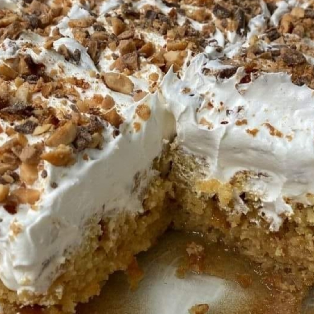 Before serving, distribute the whipped topping evenly over the cake. Then, equally distribute the toffee pieces on top.